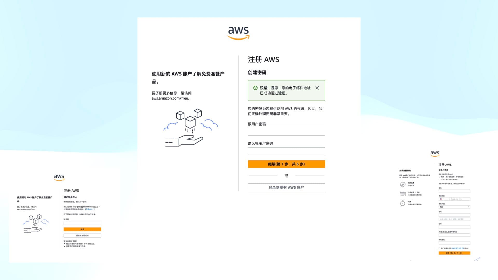 验证邮箱后,就到了设定密码的阶段。这里设置的是你根账号的密码。而根账号的用户名就是刚刚您验证的电子邮箱。