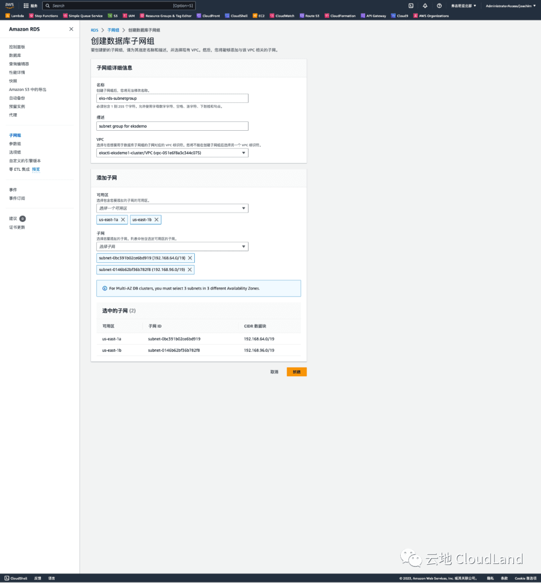 如图在 RDS 控制台, 创建一个名为 eks-rds-subnetgroup 的位于 EKS Cluster 所在 VPC 中的两个私有子网的数据库子网组.