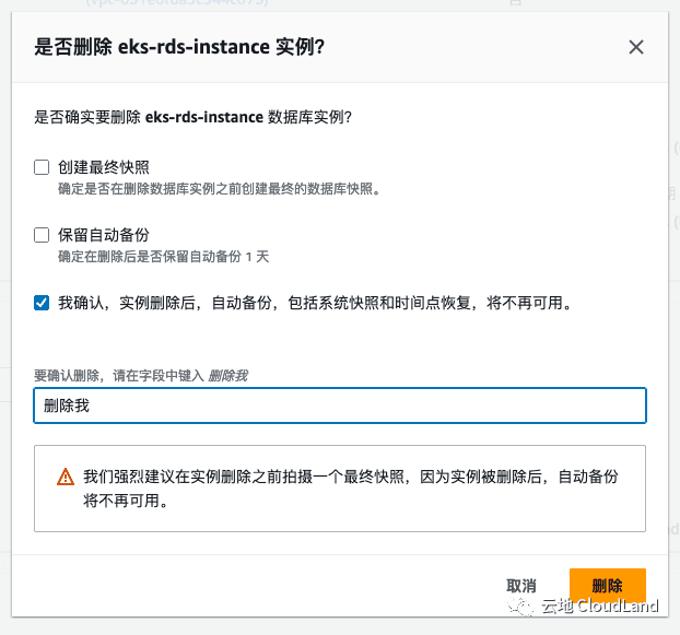 pod "mysql-client-pod" deleted删除 RDS 实例
